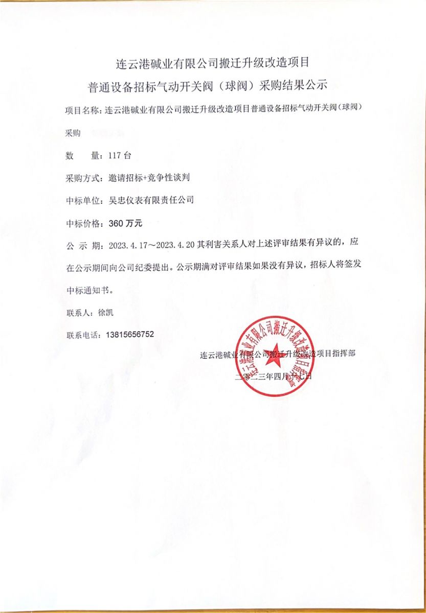 氣動(dòng)開(kāi)關(guān)閥(球閥)采購(gòu)結(jié)果公示