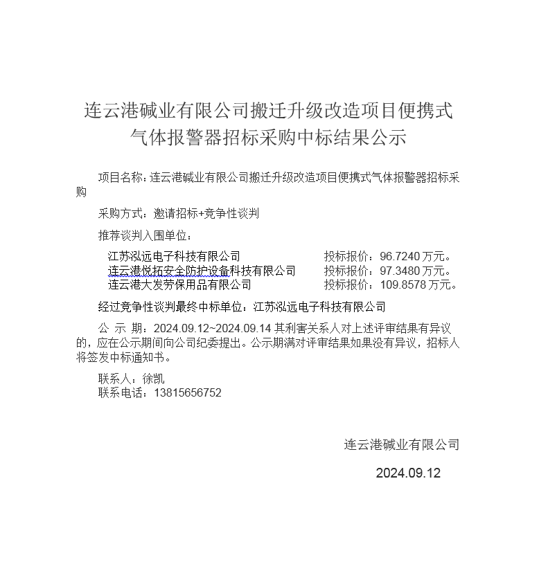 搬遷升級(jí)改造項(xiàng)目便攜式氣體報(bào)警器招標(biāo)采購中標(biāo)結(jié)果公示