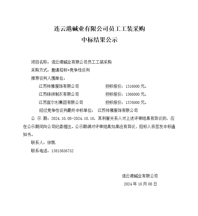 連云港堿業(yè)有限公司員工工裝采購中標結(jié)果公示